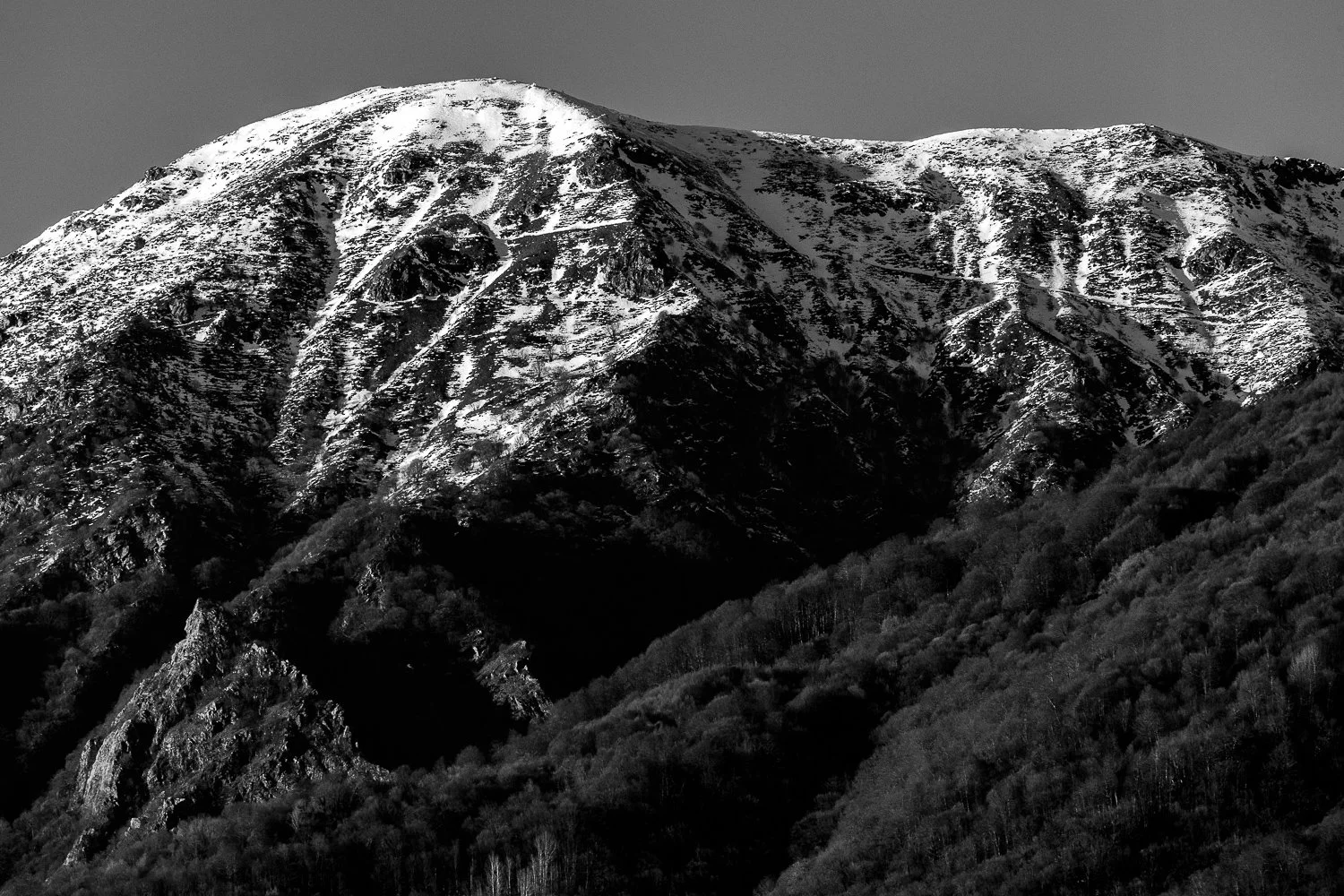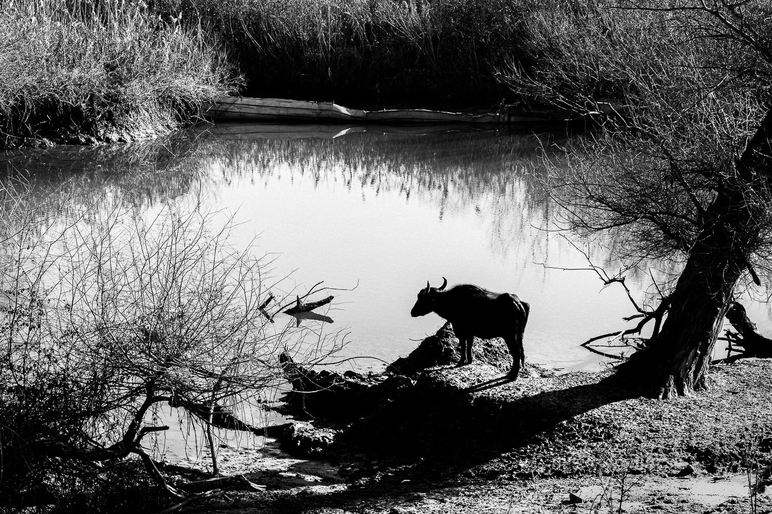 Le niveau du lac a baissé, étirant l’estran pour dévoiler de larges étendues de terres humides, vestiges des hauteurs estivales. Les perchoirs solitaires des mouettes, les racines nues et les jetées de terre improvisées se transforment en témoins d’un changement subtil orchestré par le barrage en amont. Au cœur de ces plaines, les longs sillons laissés par les machines agricoles pour lutter contre la bardane envahissante esquissent une trame silencieuse sur le paysage. Les buffles d’eau, héritiers de l’armée de Xerxès, y errent guidés par leurs bouviers, tandis que pélicans frisés, oies rieuses et flamants roses, glissant sans un bruit, poursuivent leur cycle migratoire . Au nord, la montagne Kerkini dresse sa silhouette massive, ses contreforts verts et bosselés s’équarrissent avec l’altitude et ses sommets se parent d’un blanc qui seul se reflète dans l’eau du lac ; la montagne, elle, disparaît. Chaque matin, les premiers rayons effleurent l’eau et font scintiller le plumage des oiseaux, mais les montagnes de l’ouest dérobent au lac ses dernières lueurs. Ici, le crépuscule ne s’attarde pas…