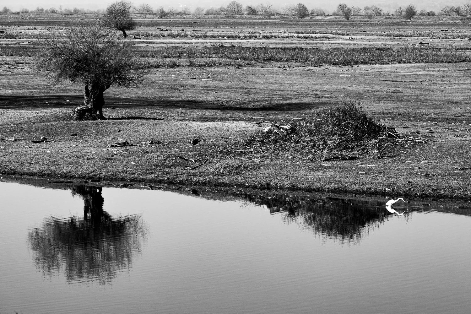 The water level of the lake has dropped, stretching the shore to reveal large stretches of wetland, remnants of the summer heights. The solitary perches of seagulls, the bare roots, and the improvised earth piers become witnesses to a subtle change orchestrated by the upstream dam. In the heart of these plains, long furrows left by agricultural machines to fight the invasive burdock sketch a silent pattern on the landscape. Water buffaloes, heirs to Xerxes’ army, roam, guided by their herders, while curly pelicans, laughing geese, and flamingos, gliding without a sound, continue their migratory cycle. To the north, Mount Kerkini stands with its massive silhouette, its green, hilly foothills flattening with altitude, and its peaks dressed in a white that alone reflects in the lake’s waters; the mountain itself disappears. Every morning, the first rays brush the water, making the birds' feathers sparkle, but the western mountains steal the lake’s last rays. Here, twilight doesn’t linger…
